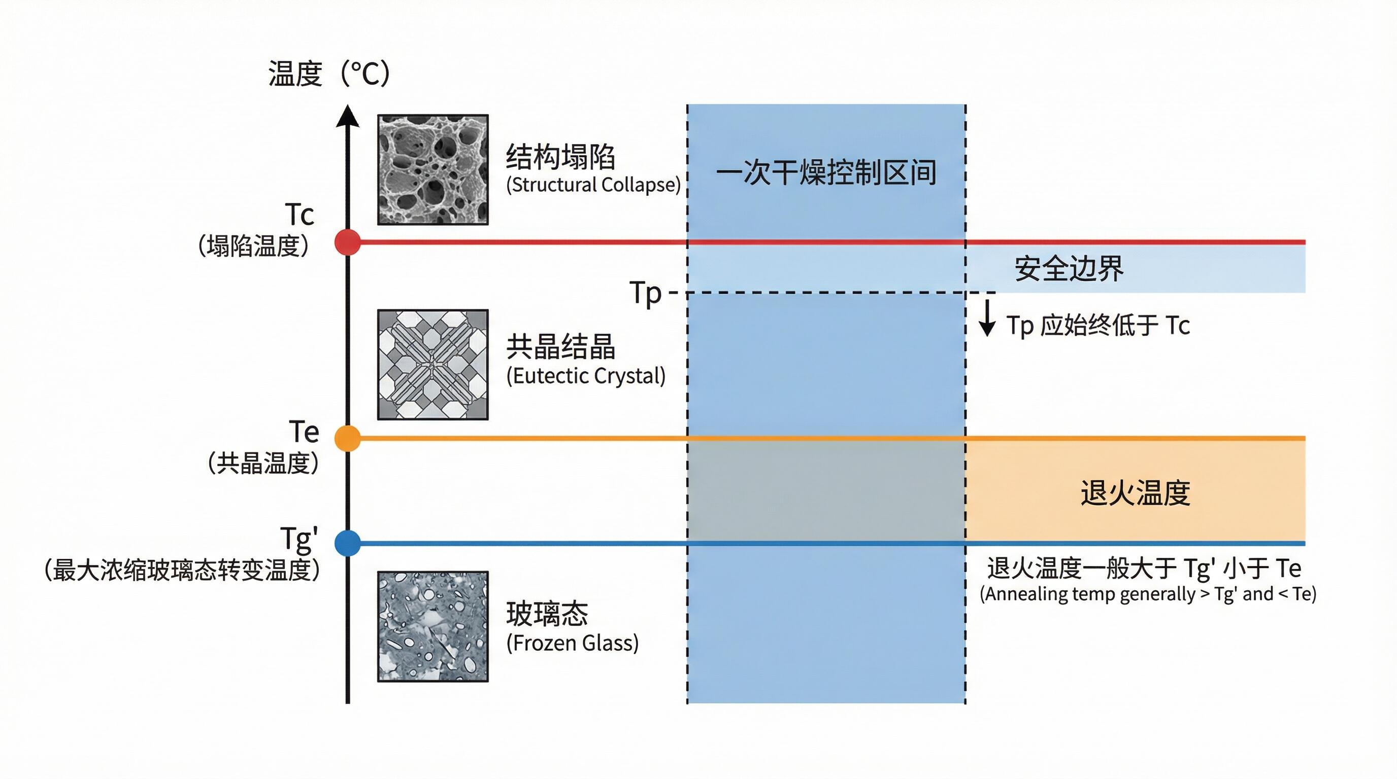- 冷冻脱水后浓缩基质的玻璃化转变点;退火温度通常设在“大于 Tg’、小于 Te”的区间以促晶均匀。