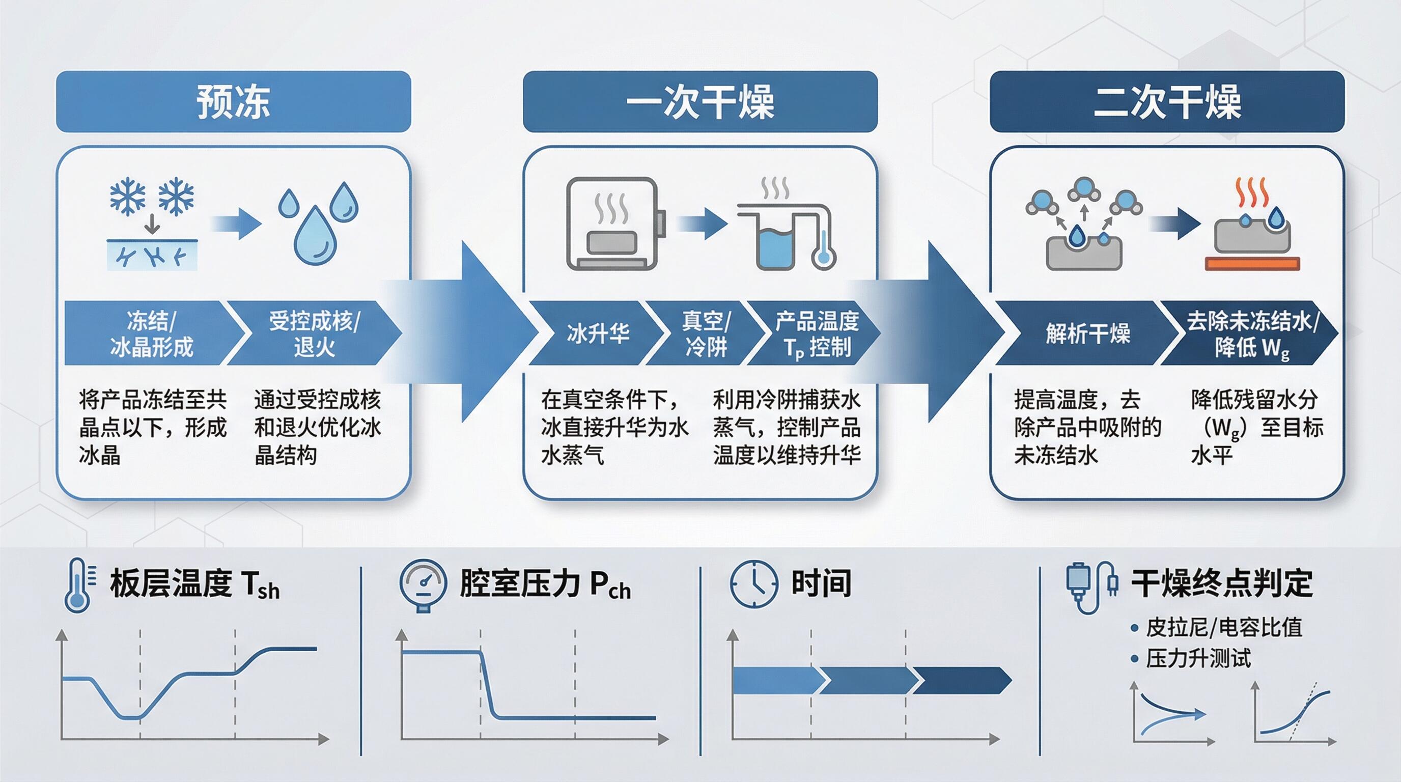 本篇进入“实操核心”:预冻 → 一次干燥 → 二次干燥。我们将用关键温度与参数约束把流程串起来,搭建可落地的优化思路。